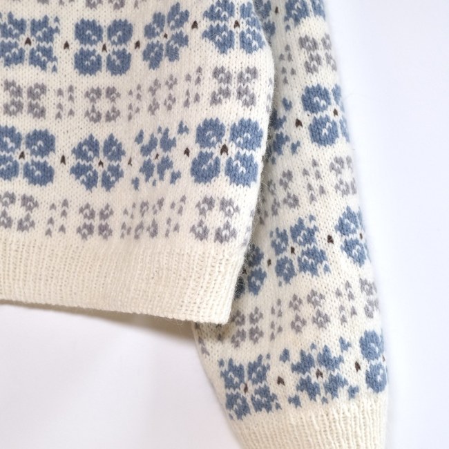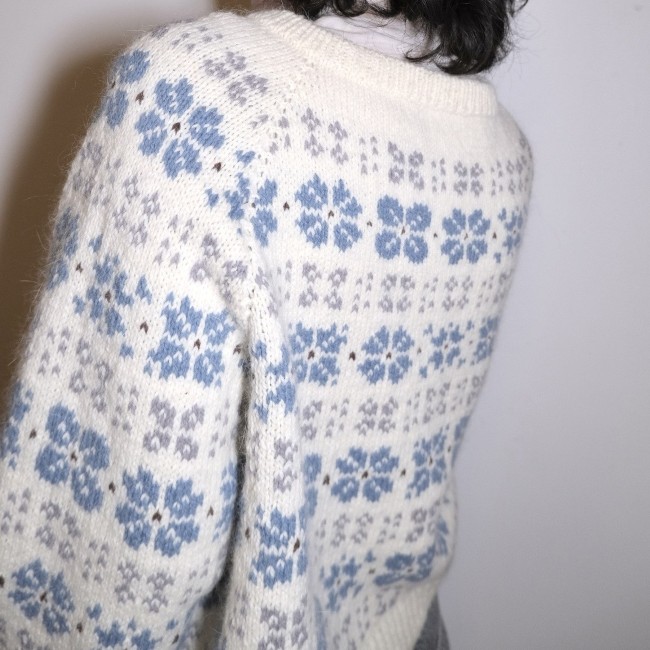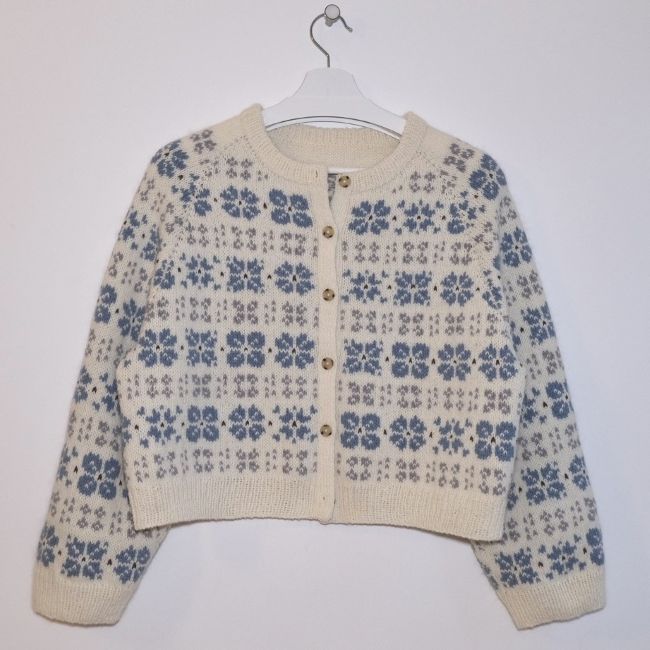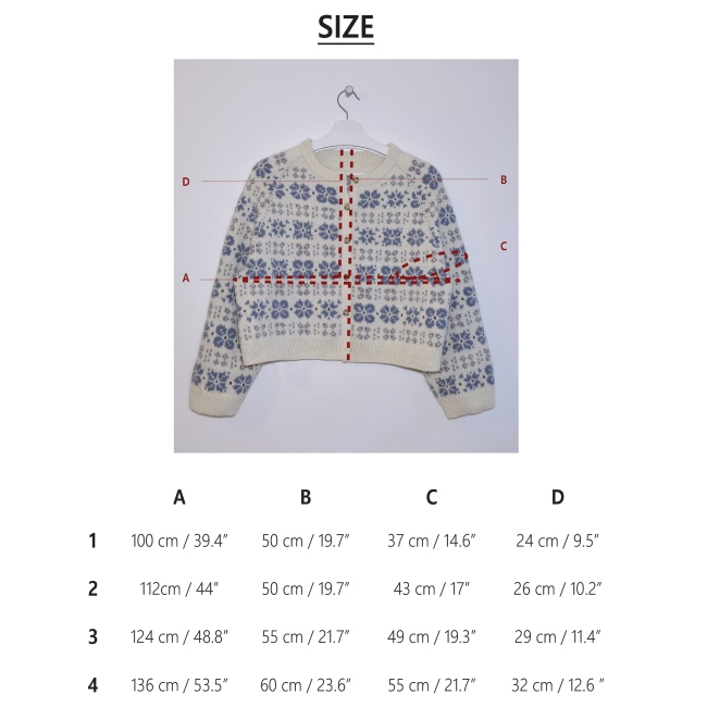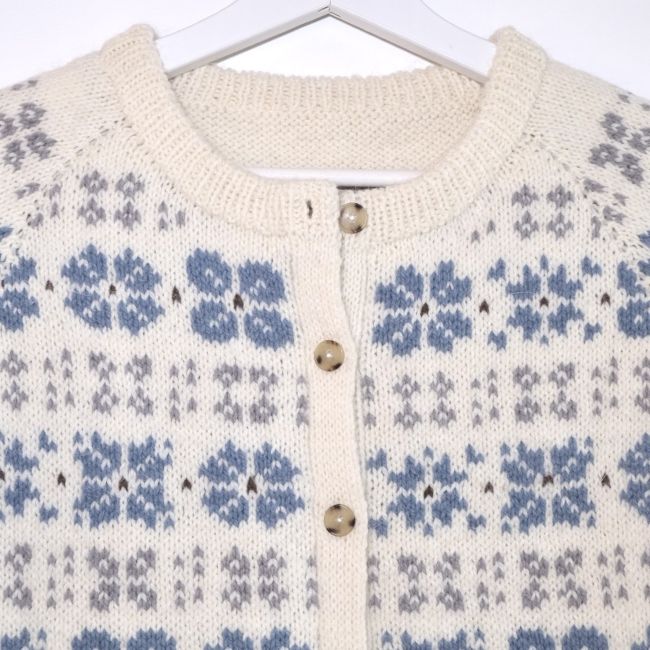 This pattern is a written pattern including charts, on A4.The Camélia Cardigan is started in a top-down flat knitting method to create a neckline, then circular knitting is started while adding steek stitches. The yoke is made by raglan increases, and after separating the body and sleeves, circular knitting is done separately. Cut the center of the front panel through the sticking technique and knit the button band. Finally, pick up stitches from the neckline to make a double-layered neckband.