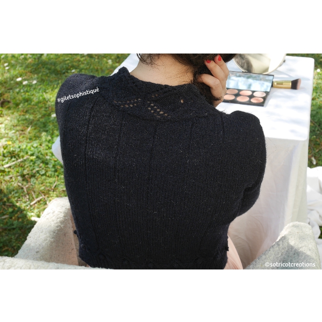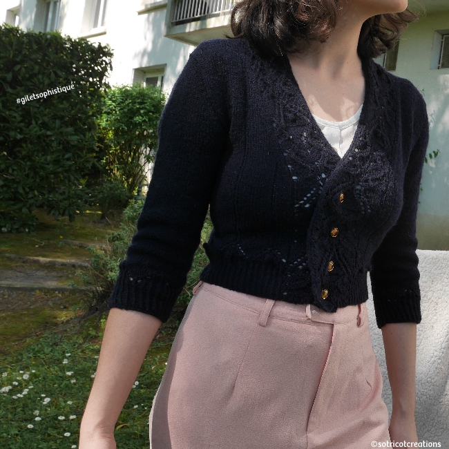 Les manches ¾ sont contruites en rangs raccourcis pour avoir un joli arrondi d’épaules et sont terminées de nouveau par de la dentelle. Il se porte aussi bien ouvert que fermé grâce à l’option boutonnage inclus dans le patron
