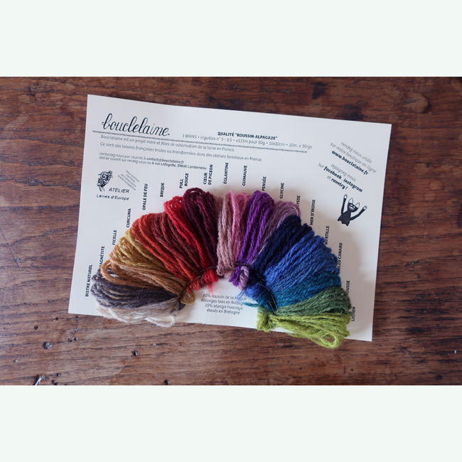 Voici la gamme • Roussin-Alpaga • , projet de valorisation des toisons de deux petits troupeaux de Roussins de la Hague élevés en bio dans les Côtes d’Armor, ainsi que des Alpaga Huacaya élevés en Bretagne.